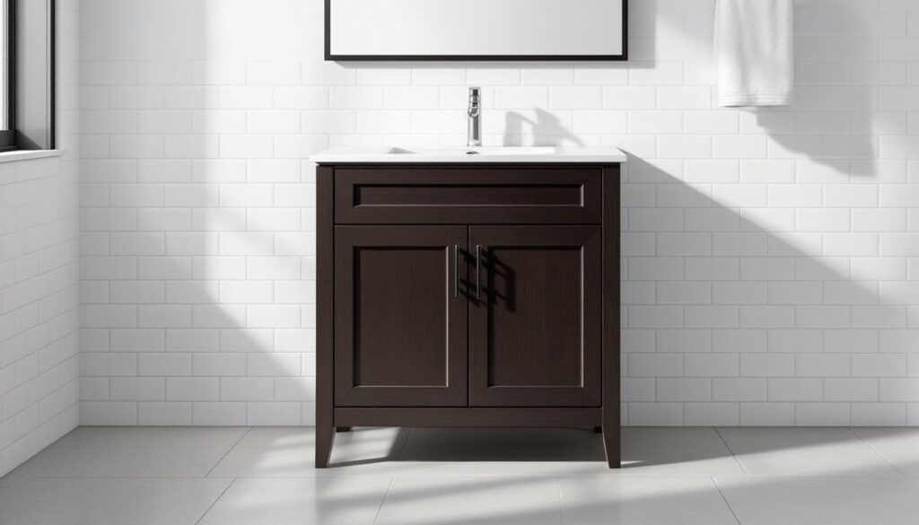 A dark wood bathroom vanity anchors the room with a warmth that white cabinets can’t match. It hides water spots better than lighter finishes, pairs